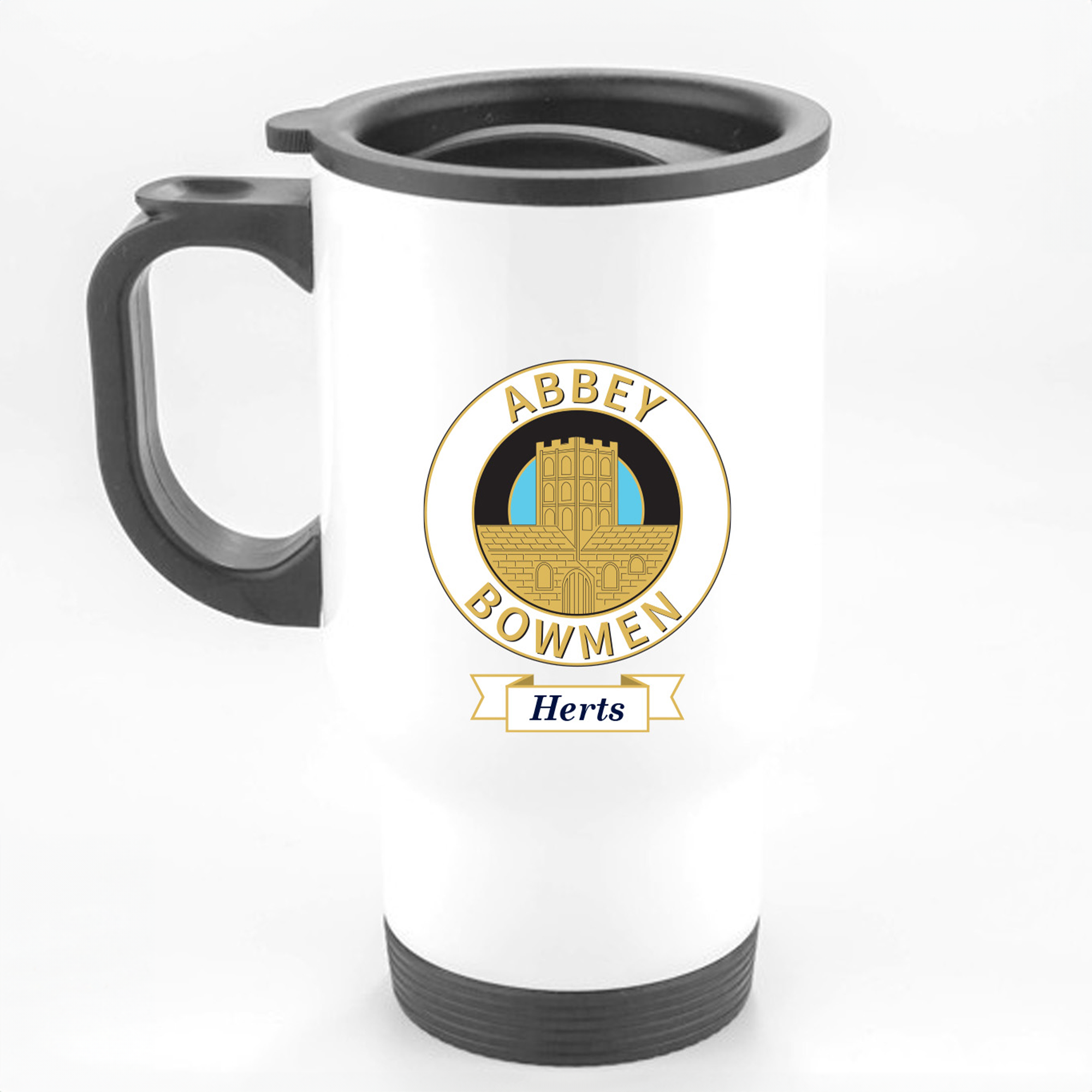 Stainless steel travel mug with a white finish.